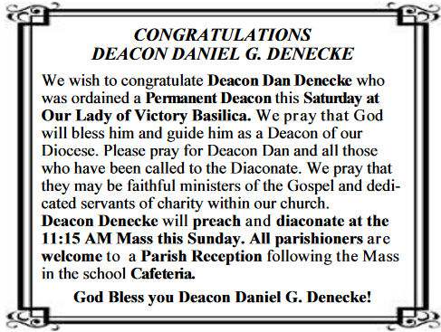 Dying to Self It's amazing how when we look back on our lives, we can connect small moments and events that lead up to big events, like today for me. Back when Deacon Don was here at Immaculate, he had an evening session at which he handed out a paper about "dying to self". It was a short reflection on practicing selflessness. About that time I was meeting with a small group of men rooted in the Cursillo movement where we held each other accountable for putting faith into practice. One week I gave out some extras of the "dying to self" handout to the guys and soon forgot about it. One of men would remind me every once in a while how much comfort and consolation he would get from reading the handout. Reading it helped him to have peace and acceptance during tough moments. One time I asked if he could send me copy of his because I had lost mine and even forgot about it. Through a number of other small moments like this, all connected, all involving God speaking through the people in my life, I have arrived at this point of being a deacon, discussing the Gospel today where Jesus tells us to follow Him by "dying to our self". It's difficult to deny ourselves Looking back on the "dying to self" handout, I realized why I keep forgetting about it. It's a difficult challenge. One line read 'When you are forgotten or neglected and you don't hurt with the insult, but your heart is happy-that is dying to self'. Another read 'When you can take correction, when you humbly submit inwardly as well as outwardly, with no rebellion or resentment rising up within your heart-that is dying to self.' I've failed both of those at times. It's hard to control impulsive emotions in some of these situations. It helps to think of our suffering Savior and think, 'If Jesus did that for us, we can endure this suffering.' It also helps to know what happens when we think less of ourself and more of God and others: a life of meaning and happiness. It's a leap of faith but it has frequently been my experience that thinking less of my own wants, ultimately leads to goodness. Parents don't need to go far looking for sacrifice, it's built into the vocation. There are sacrifices followed by moments of great joy. This is true in different ways for married life and single life as well. James challenges us to do more, to show our faith through action. How many times have we heard that? Exercise more, read more, pray more, work more, super size it, all you can eat, more homework, make more money. Formation for being a deacon was 'doing more' and it was challenging at times. Sometimes it threw my life out of balance. But two important pieces of advice made it possible for my classmates and I to succeed. The most important advice was to maintain and improve our relationships with God and with the people we love. It is the key element in getting back to balance when it gets too busy. The other good advice was the 'pruning' of my life. We all do many good things but we have to make sure we are doing what is best, what we discern the will of God is for our lives. I had to stop doing many good things to succeed, which I miss, like folk group and my men's group. But there has been consolation. There has been great joy and satisfaction in the coursework at the seminary. It is a very exciting campus right now with many new and returning excellent teachers, a world class theological library, and a sharp new education center with modern technology for the classroom of today. There has also been joy in ministering to the people of God. I look forward to more ministry now that my seminary studies are less intense. So the Christian action James asks us to take up does require sacrifice, but will result in a life of meaning followed by happiness that can't be found in material pursuits but can only come from above. Conclusion Five years ago, I had a hard time seeing my self giving homilies and moving from the music groups to the altar and out into other ministries but every small step has been with the affirmation and guidance of the Holy Spirit speaking through many of you. I count on you for help with discernment of what God's will is for my life. Thank you. I hope I can return the favor as we move on together through selflessness and the best Christian works for our lives, towards the truth of God. |