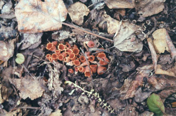 One of a group of winter to spring mushrooms called the Scarlet Cups. This cluster of small (1cm+/-) fungi